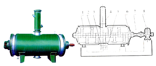 具有結構簡單,操作方便,使用周期長,性能穩定可靠,蒸汽耗量小,適用性能強,產品質量好,適用于不耐高溫、易燃、調溫下易氧化的膏狀物料的干燥,該機經用戶長期使用證明是一良好的干燥設備。原理:被干燥物料從殼體上方正中間加入,在不斷正反轉動的耙齒的攪拌下,物料軸向來回走動,與殼體內壁接觸的表面不斷新,受到蒸汽的間接加熱,耙齒的均勻攪拌,粉碎棒的粉碎,使物料表面水分有利的排出,氣化的水分經干式除塵器、濕式除塵器、冷凝器,從真空泵出口處放空。結構:真空耙式干燥機的主要部件。